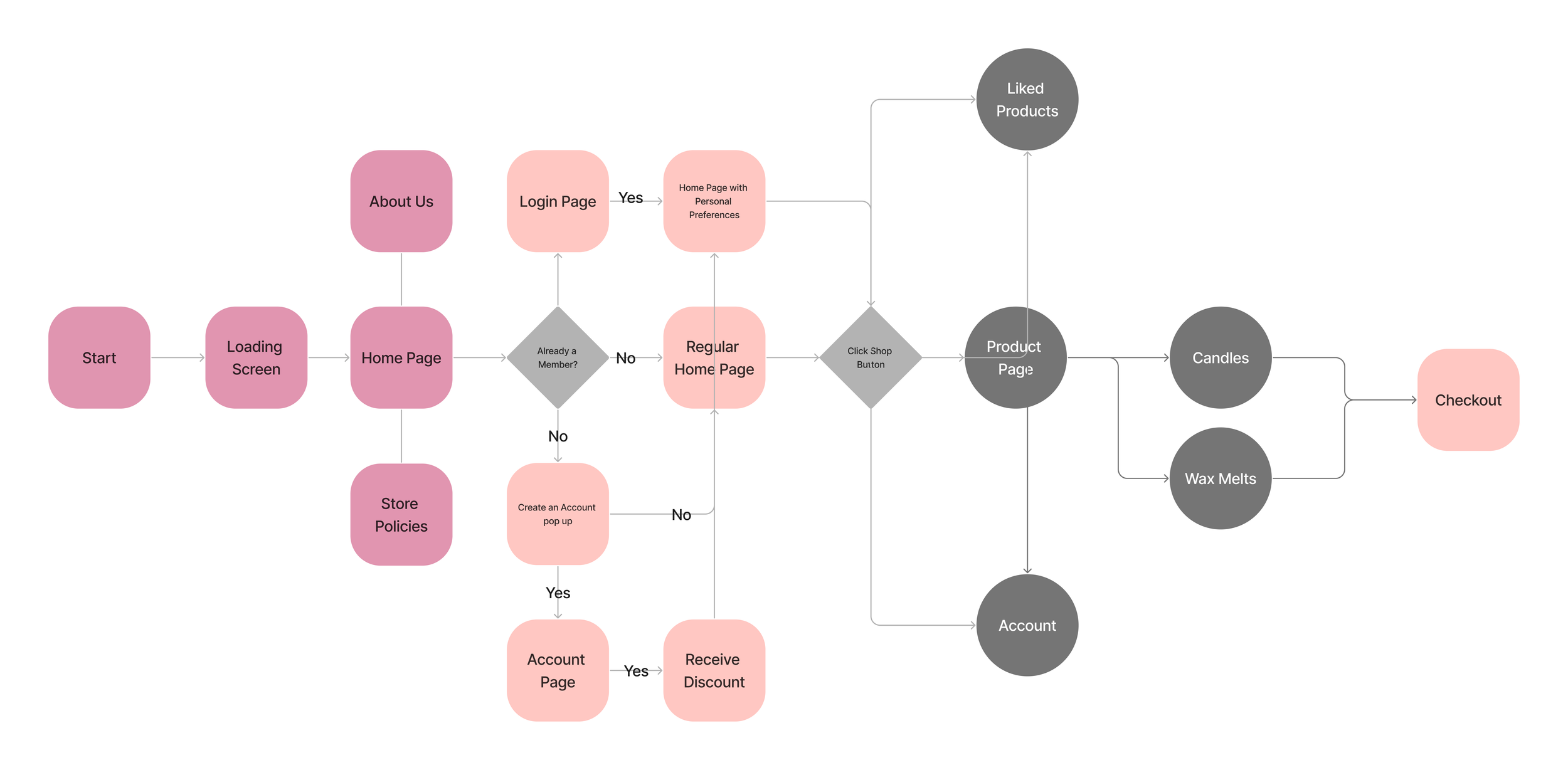 Before designing the wireframe and screens for Sweetpuffs, I created a user flow to represent the paths a user might take when using the app. The user flow starts with several options, including the home page, about us, and store policies. There’s another pathway if a user clicks on the pop-up ad asking members to sign up. Eventually, all paths lead to checkout. The pathways are similar to a user interacting with the Sweet Puffs website.