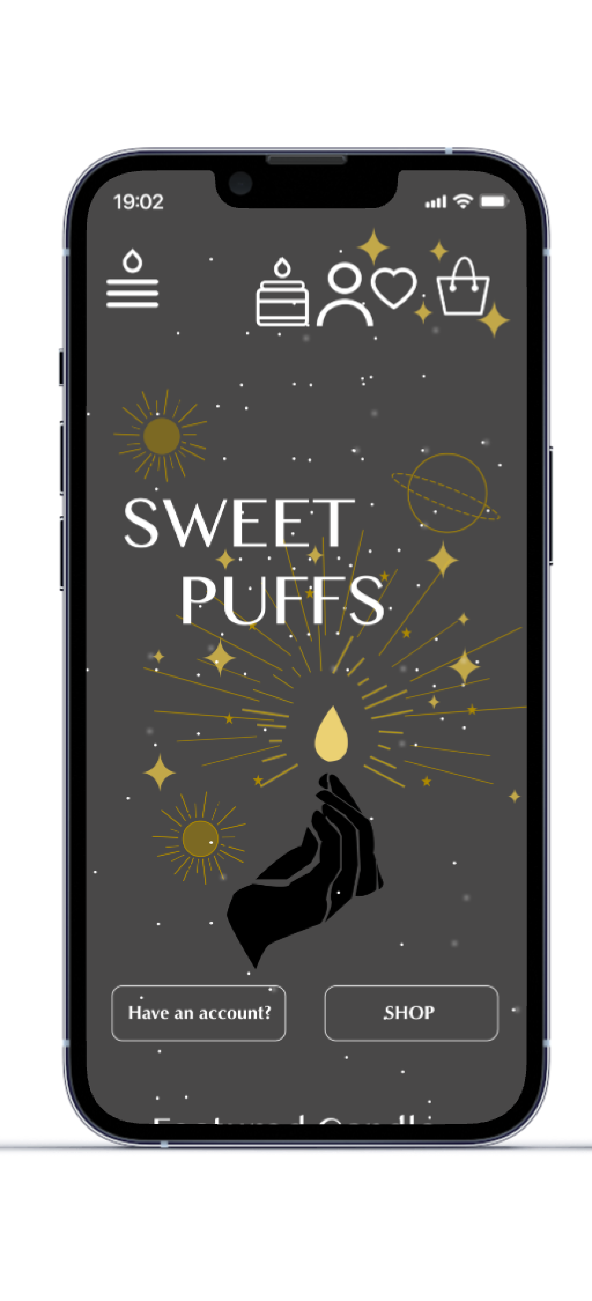 The style guide was based on the color schemes used from the real Sweet Puffs candle site. I kept a pink color scheme that was used throughout the site the same for my client but introduced them to brown, gold, and neutral tones for better unity and balance. For the font, I went with Oriya MN and BiauKai as the serif look matched well the logo. Since the previous logo had a celestial theme to it, I decided to add celestial designs in my app with the tool Adobe Illustrator. Designing the elements brought more pop to the pages and especially in the advertisement sections.